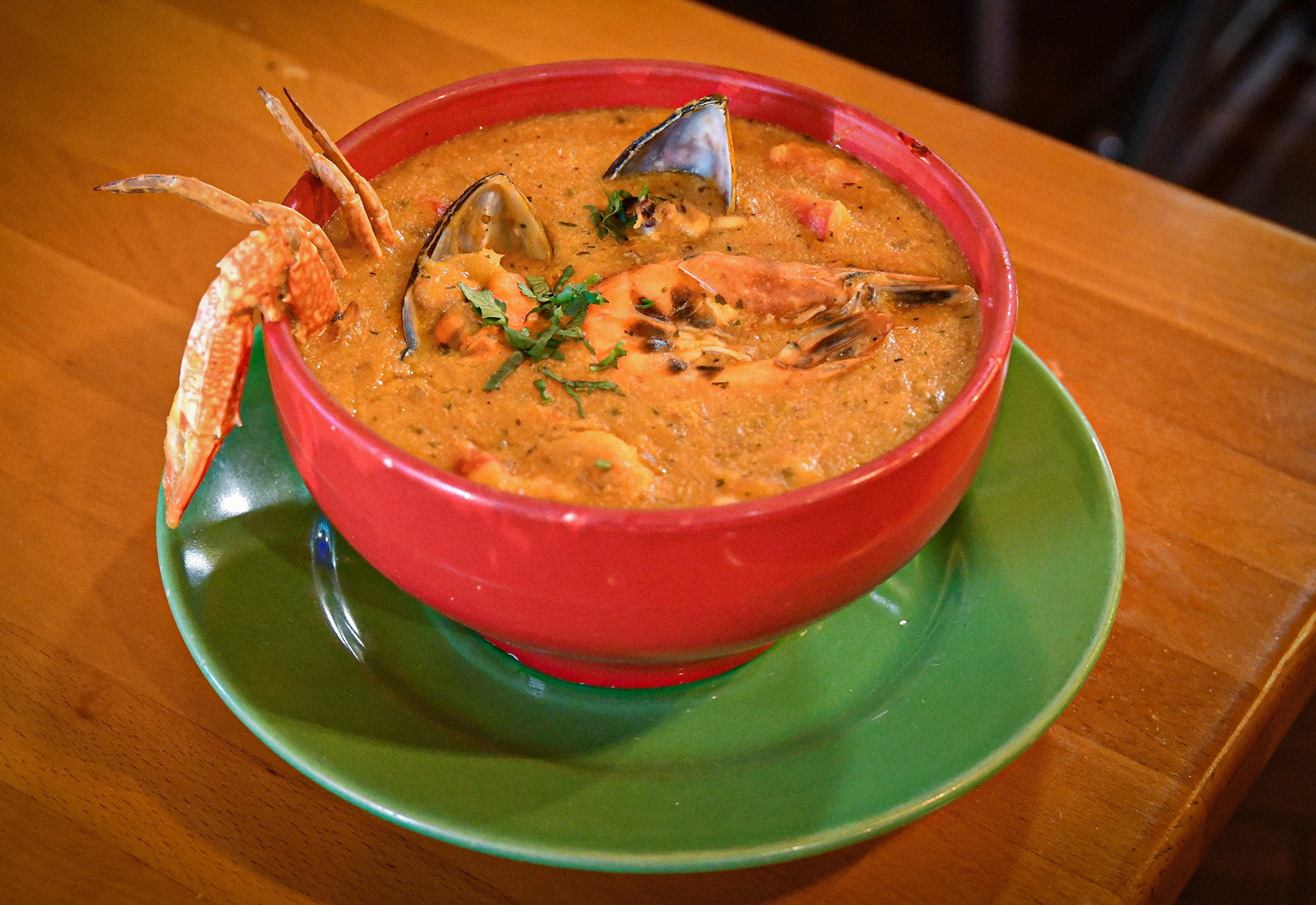 Pargo rojo guisado con salsa de coco con camarones, servido con arroz y tostones.