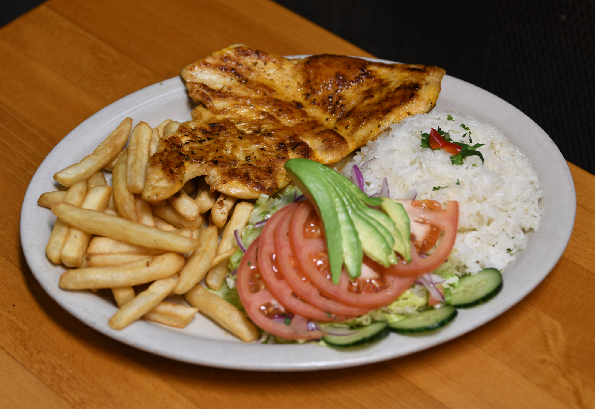 Pechuga de pollo a la plancha, arroz, papas fritas y ensalada
